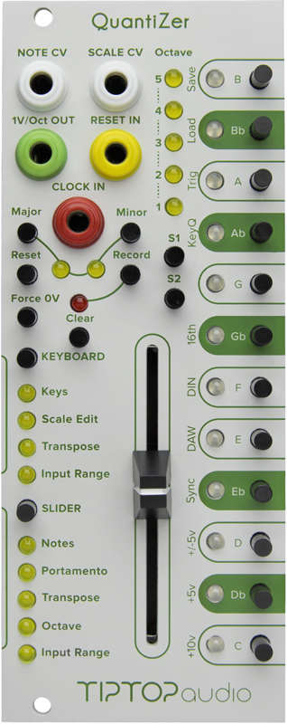 在前面板的功能由傳統 Quantizer 改造設計,可融入演奏內,使用上也相當直覺性;中央的推桿可以拿來做音符演奏、將輸入的序列加入滑音、或做不同的移調; 12 個音符鍵盤可自訂音符、增加或減少在音階上的音...,等量化音符的工作,並與其他模組同步。