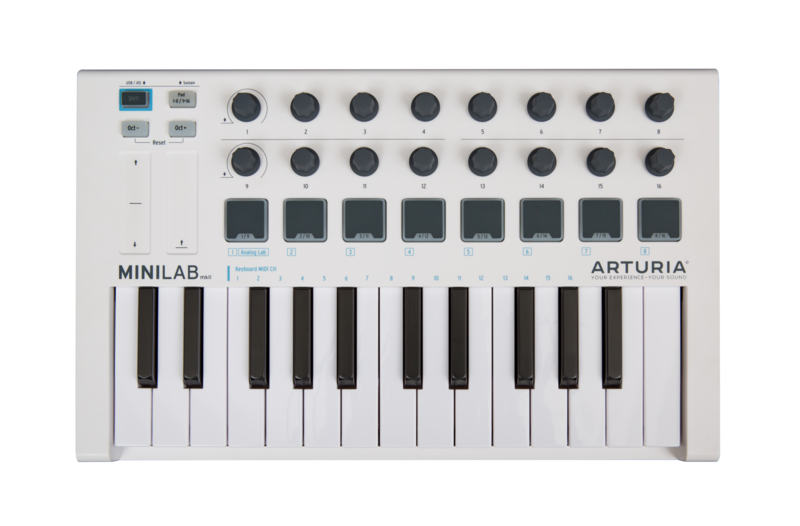 Arturia的Minilab MkII 包括了 25 個帶力度感應的 silm 鍵盤,上下兩個八度的選擇鈕,還有 RGB 背光的打擊墊,不管是做節奏,或是切換模式,選擇設定,都非常好用。