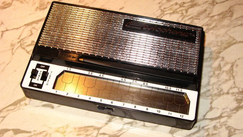 Stylophone 最原本是 Brian Jarvis 於1967 發明,然後在 1968 年由 Dubreq 這家公司開始生產販售,操控的方法也相當新奇,是使用一支筆在觸控條上移動,依照不同位置所送出的電壓,來觸發裡面的元件並改變它的音高,算是非常陽春,而其他可調變的選項只有 1.音量 2. Vibrato(顫音) 3. 還有一個調音的旋鈕。不過當時的銷量非常好,可能以音樂玩具來說算是非常有趣吧!
