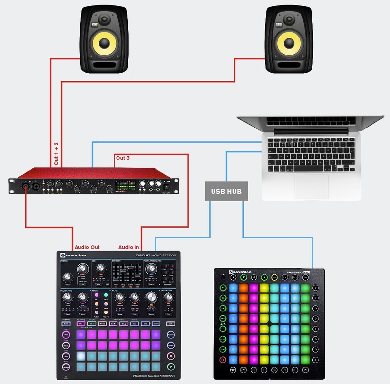 1. 將 Circuit Mono Station 直接輸出聲音至錄音介面;USB 線連接電腦和控制器及錄音介面;錄音介面直接輸出所有聲音到喇叭。
