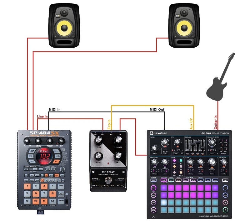 2. 先將吉他聲音輸入至 Novation Mono Station,然後串連效果器,最後輸出到 SP404,再從 SP 404 輸出至喇叭;使用 MIDI 連接與 SP404 同步;用 AUX CV 替代表情踏板控制效果器的參數。