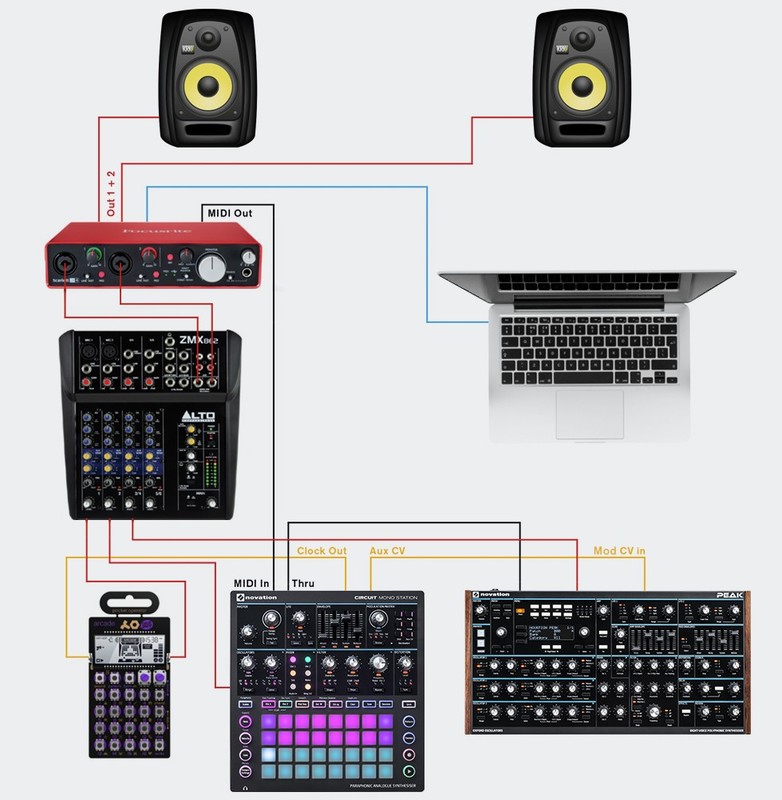 3. 所有合成器音源先進到混音器,再從混音器送出雙聲道的聲音到錄音介面,最後聲音從喇叭;從錄音介面送 MIDI 訊號給 Circuit Mono Station,在從 MIDI Thru 送訊號控制 Peak;黃線的部分則是送 Clock 到 PO Arcade 以同步節奏,也送出 AUX CV 來調變 Peak 的參數。