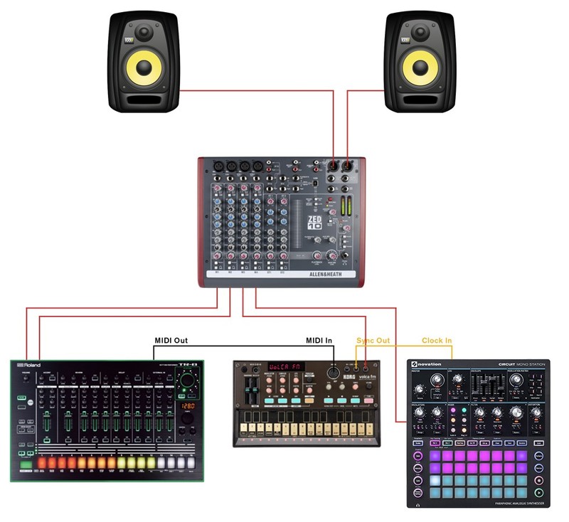 4. 把鼓機、Volca FM 和 Circuit Mono Station 的聲音都送到混音器裡面,也直接將所有聲音從混音器再送到喇叭;鼓機當總速度使用 MIDI 與 Volca FM 同步;再從 Volca FM 送類比的 Sync out 到 Circuit Mono Station 來同步速度。
