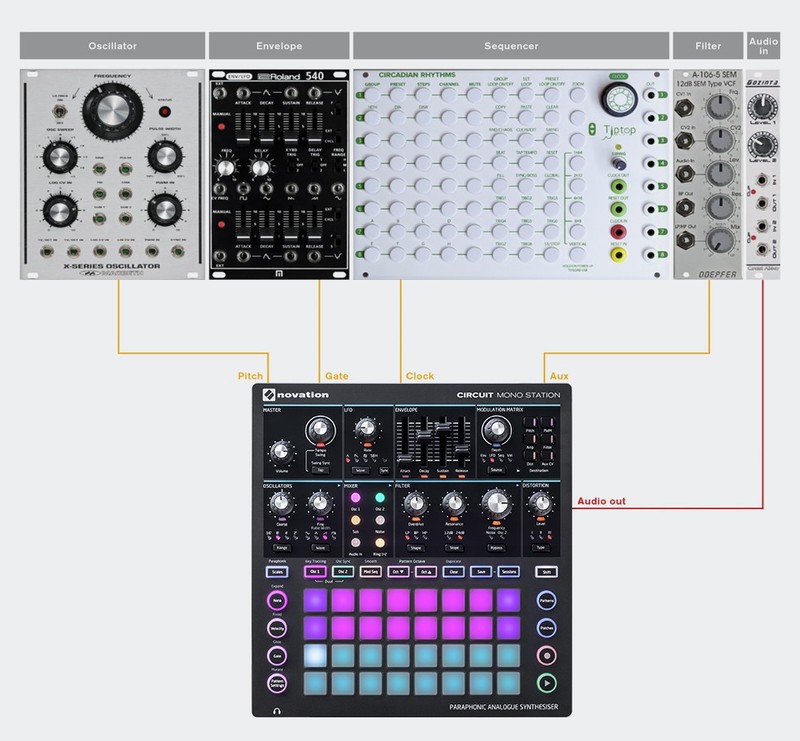 5. 將 Circuit Mono Station 的聲音送到模組合成器的混音器上,也使用所有類比 CV 訊號來控制模組合成器的,Pitch 送到 Oscillator 可改變音高,Gate 送到 Envelope 可調整音的長短,Clock 送到 Sequencer 可同步速度,Aux 送到 Filter 可調變參數,非常好玩的!