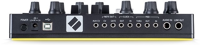 Circuit Mono Station的連接選項非常齊全,讓你在連接到其他類比或數位樂器時都相當方便。從他機身後方我們可看到它帶有 AUX CV、CV、Gate、Clock In/Out、MIDI Thru/In/Out、Audio In、Line Out、USB 和電源供應。