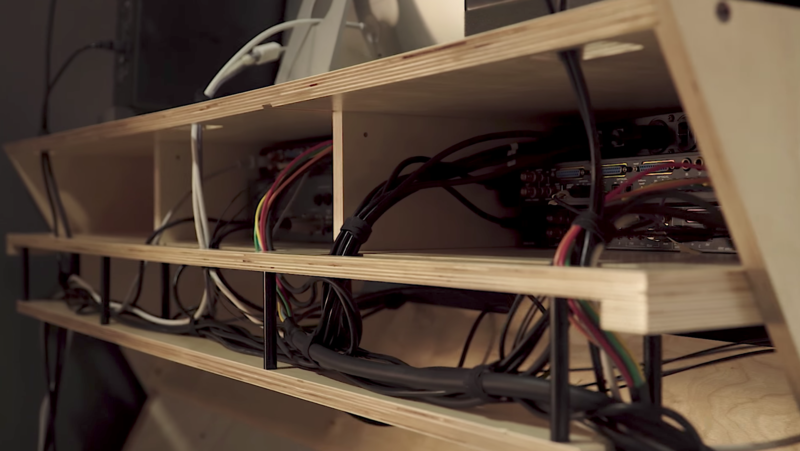 可看到是個兩層的工作桌設計,最上層可放置喇叭和螢幕,中間這一層則是可放置硬體,包括 9U 聲音處理器模組 rack 機櫃,當然也能夠放錄音介面,或是比較小型的樂器,例如模組化合成器之類的。