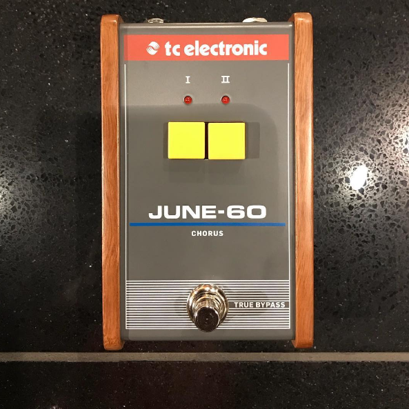 事情發生在今年的 GuitCon,GuitCon 是 2017 年第一次舉辦,集結了各個音樂類型的 Youtuber,並且討論和展示各種奇奇怪怪的音樂產品。雖然今年的規模還不大,但是 TC Electronic 在 GuitCon 中,提出了一個超狂的效果器概念,就是將合成器經典 Juno-60 的 Chorus 做到吉他效果器上,並且有著帶有惡搞意味的名字 June-60。June-60 的外觀設計的超級像 Juno-60,灰色的鐵殼,帶有木邊和黃色的按鈕,然後同樣也有兩組 Chorus 的切換鍵,算是 TC 對於 Juno-60 的致敬。