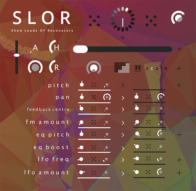 SLOR 就像 SLOO 一樣,它可以讓你藉由這簡單的介面做一些新潮的聲音。在 SLOR 之中,共鳴引擎取代了合成引擎,讓你可以用自有的音源去打造一個野生音景,也是將背景雜音轉換成電影音景,或是在現場表演的時候產生一種讓人驚豔的效果。它使用了 32 種參數去創造無限的共鳴,不論你輸入了什麼,都可以藉由強而有力的 LFOs 和 Modulation 來創造巧妙的 Reverb、Chords 等等 。簡單來說就是將一個簡單的音訊,轉變成一個巨大複雜的結果,就像是蝴蝶拍動翅膀造成地震的蝴蝶效應。