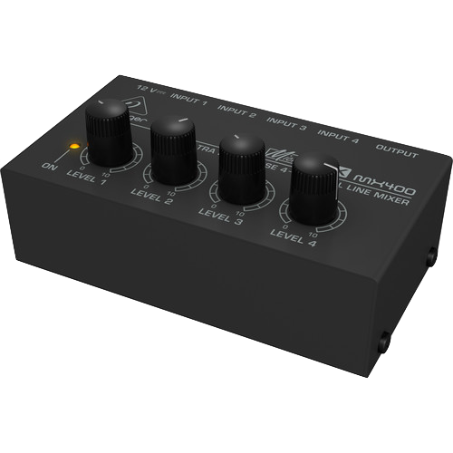 共有 4 軌 6.3 mm phone line 輸入,以及 1 軌 phone 輸出。MX-400 是一個 CP 值高的小型混音器,價格平易近人,不管是音樂製作者、錄音室工程師、家中宅錄等等都會需要更多的輸入,適合 keyboard 多軌混音,輸出至 CD 或 MP3 播放器,可獨立控制輸入音量。