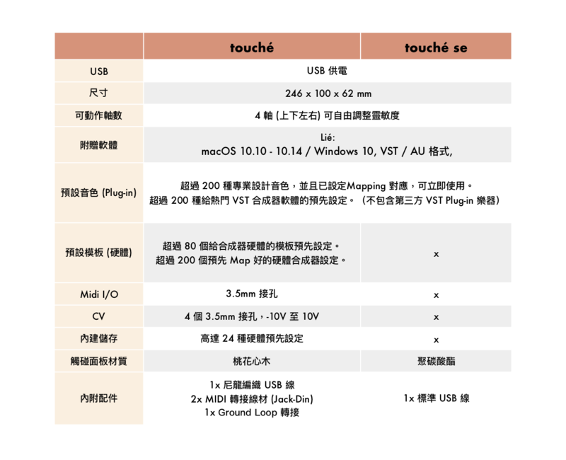 TouchéSE 延續了經典的 Touché 的品質、專利機械零件,TouchéSE 新增了超過 200 個聲音,pre-mapped 讓它擁有了更多控制能力的優勢,跟擁有超過 200 個預先設定的第三方 VST 樂器一樣優秀。另外, Touché 的軟體 Lié 讓使用者可以更輕鬆地去操縱和解鎖它們的第三方 VST 樂器資料庫。可以更快速的 map 參數,用一個令人印象深刻又驚訝的軟體能力,來創造聲音和表演 。