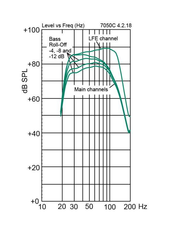 立體聲響以及多軌傳輸, 7050C 除了搭載五個 Input / Output ( 85 Hz Filtering ) 之外還另外附設一個 120 Hz 的 input,讓 7050C 可以同時應付 Stereo 以及多軌工作的需求,此外 7050C 的外箱層式螺旋設計提供更廣泛的低頻以及低度的失真。後面板提供低音相位、LF roll off、10 dB LFE 增益控制,以及 ISS 省電模式的開關控制。