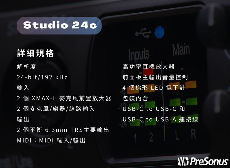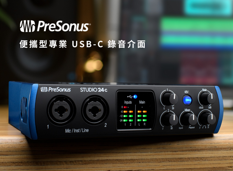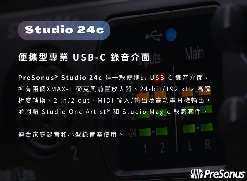 無論是剛入門的錄音新手或是經驗老道的製作人想要將器材精簡化,PreSonus Studio 24c 都能給予最清晰且高解析的聲音品質,除了能相容多款 DAW 之外,也能夠使用附贈的 Presonus Stiodio One Artsit,立即開始你的音樂製作之旅。