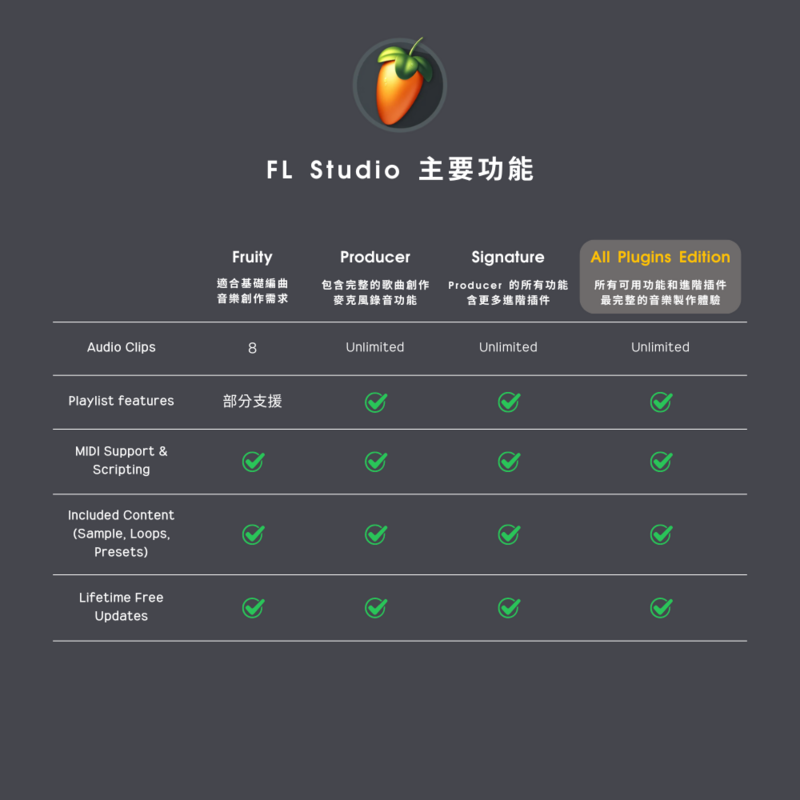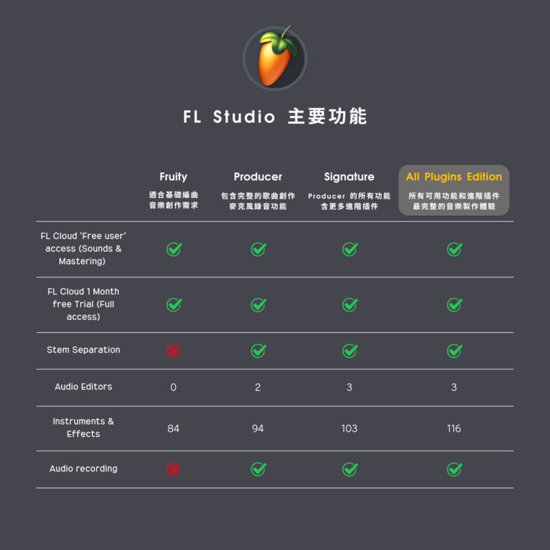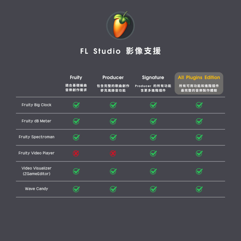 無論你正在進行作曲、錄音(包含麥克風錄音)、剪輯或混音,FL Studio Producer Edition 都是一款創新、強大且值得信賴的音樂製作工具,適合需要完整製作功能的創作者與製作人。