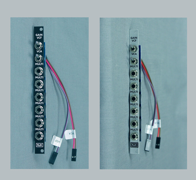 Switch “up” is the same as having the gain jumper in place, switch “down” is the same as removing the jumper, and gives higher gain. Using these switches gives a similar effect to the old "headphone out to external input" trick on the original Model D but with a much wider overdrive range, particularly from the VCA. We have also included a six way passive multi.