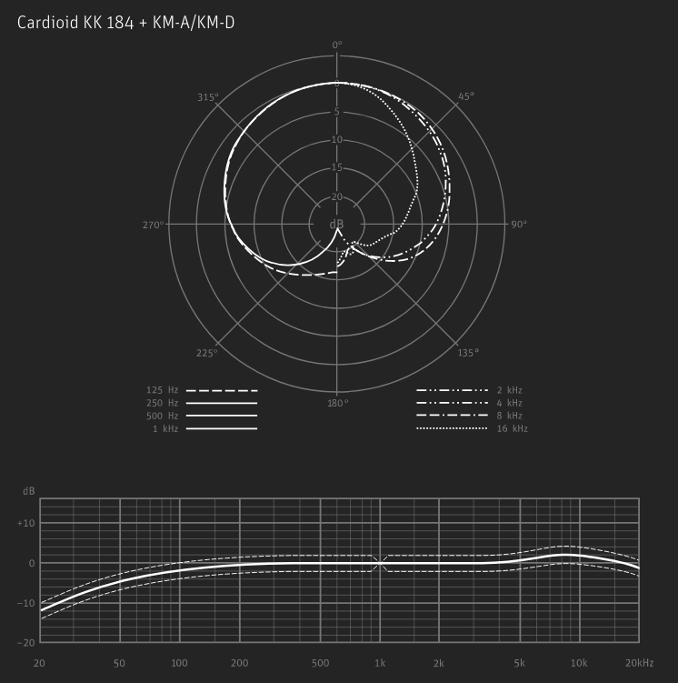 儘管價格具有吸引力,KM 184 提供了最先進的 Neumann 工程技術。其心形指向模式與頻率無關;後方聲音(180°)的拒絕效果優秀,即使在低頻時也是如此。在實際使用中,寬拾音角度內沒有聲音染色,這對多麥克風設置和精確的立體聲/環繞聲成像至關重要。KM 184 的頻率響應非常平滑且線性,在 9 kHz 附近略有高頻提升以增加亮度。其創新無變壓器頭放大器提供 125 dB 的寬動態範圍,並經過精心設計以保持膠囊的聲音完整性。KM 184 的自噪聲極低,僅為 13 dB-A,並且可以在高達 138 dB 的聲壓級下無失真地處理高聲壓。由於其低阻抗輸出階段,KM 184 可以驅動長達 300 米(1000 英尺)的長電纜而不會有傳輸損失。