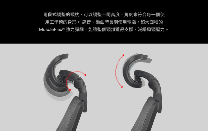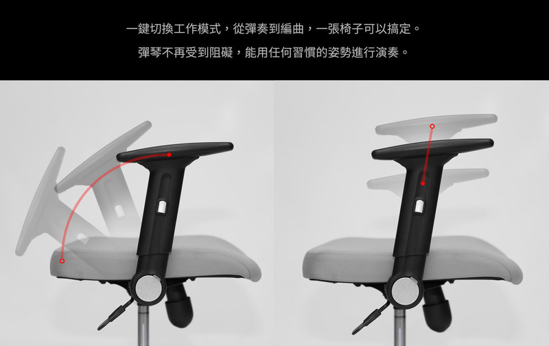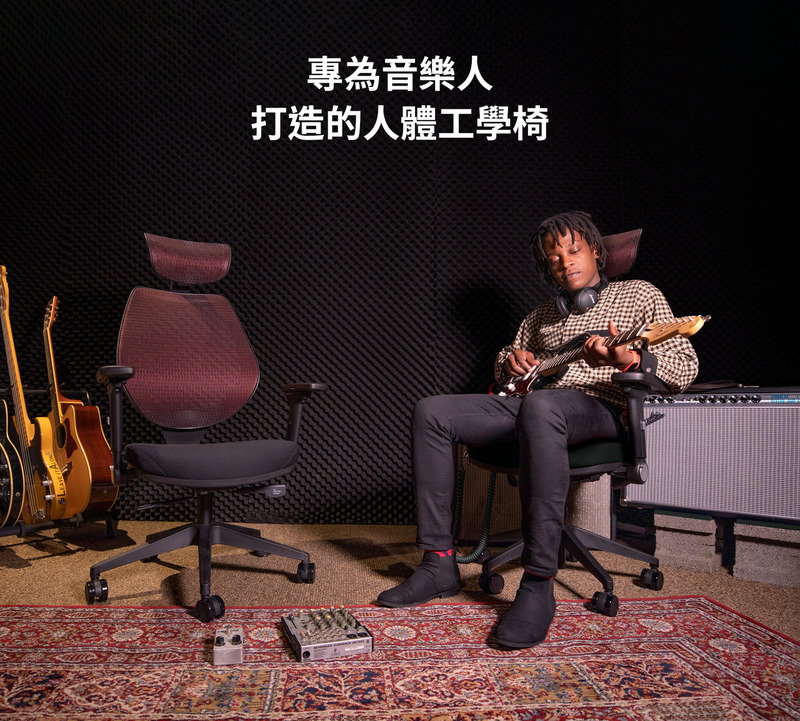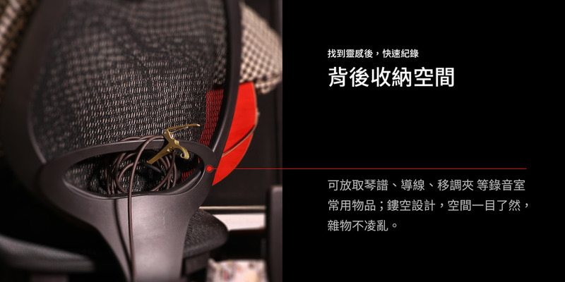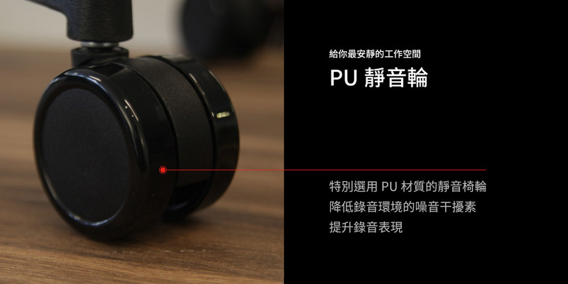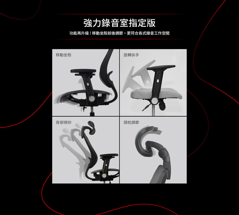 錄音室升級版配置:工學彈力椅背(含頭枕)、3D旋轉後收扶手、強網網座、座殼滑動三段可鎖定傾仰SXTG底盤、尼龍細腳、PU靜音輪