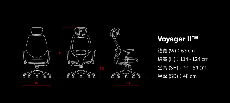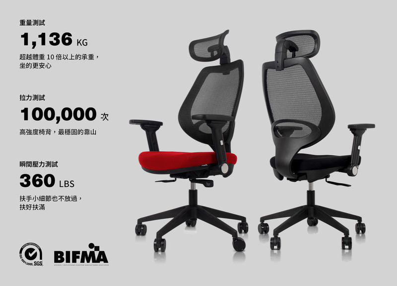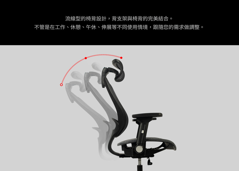強壯的腰部支撐;可收折及高低調整的扶手配置;背後收納空間;可依據個人喜好選擇 成型方厚泡棉座 / 網座