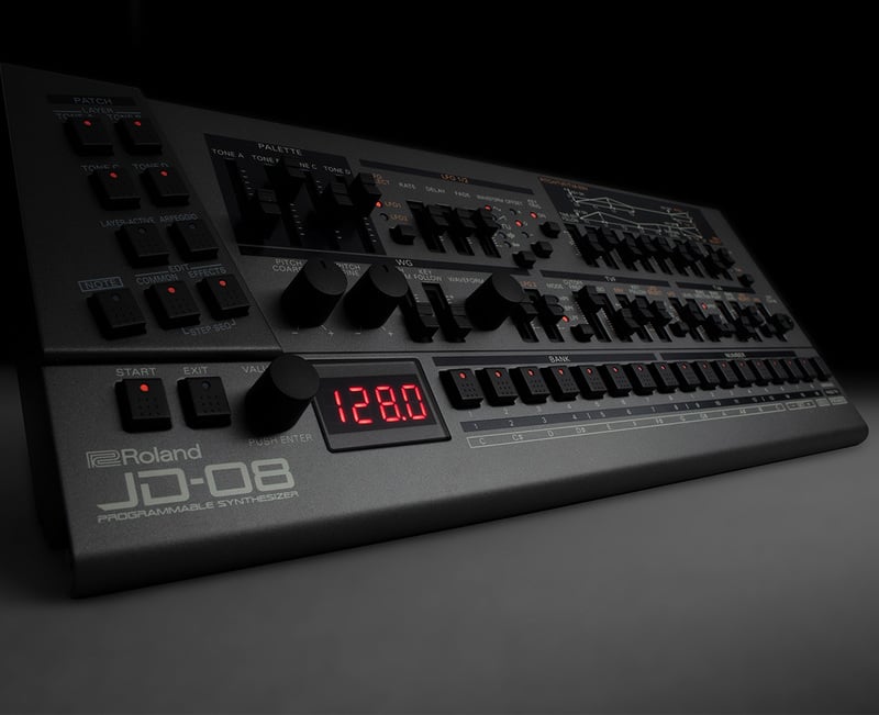 在 90 年代初期,以預設音色為主而手動實體控制功能精簡的數位合成樂器蔚為主流。在 1991 年,JD-800 改變了這種主流,透過滿載著控制裝置的面板和侵略性十足的的電子聲音調色板,將合成器世界帶回了音色製作的根源。JD-08 搭載了原版的 64 個預設音色,完美地重現了四音的結構、108 個波形,和獨特的兩系統多重效果器,這些都是 JD-800 複雜、尖端音色的核心。