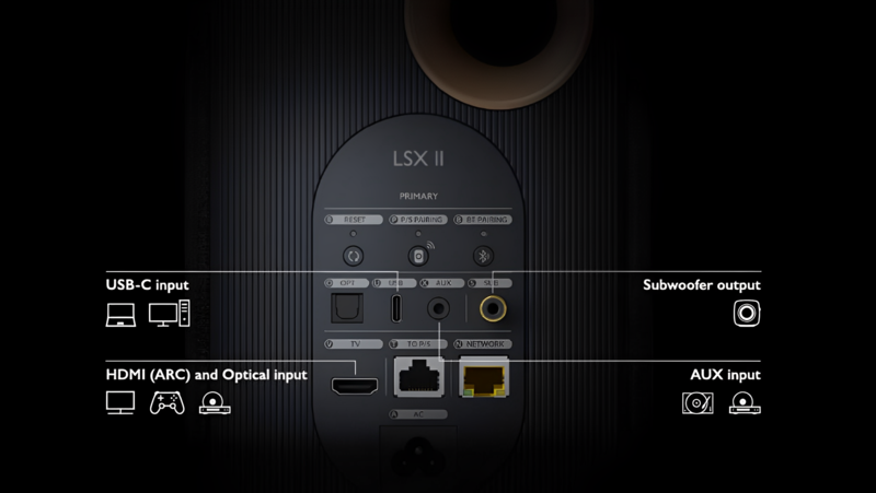 您可以透過 HDMI ARC 來將 LSX II 與電視連接;透過 USB-C 來與筆電,甚至是黑膠唱盤、CD 播放器、或遊戲主機連接。如果想要為電影或音樂增強低音音效,還有專屬輸出孔可連接 KEF 重低音揚聲器。
