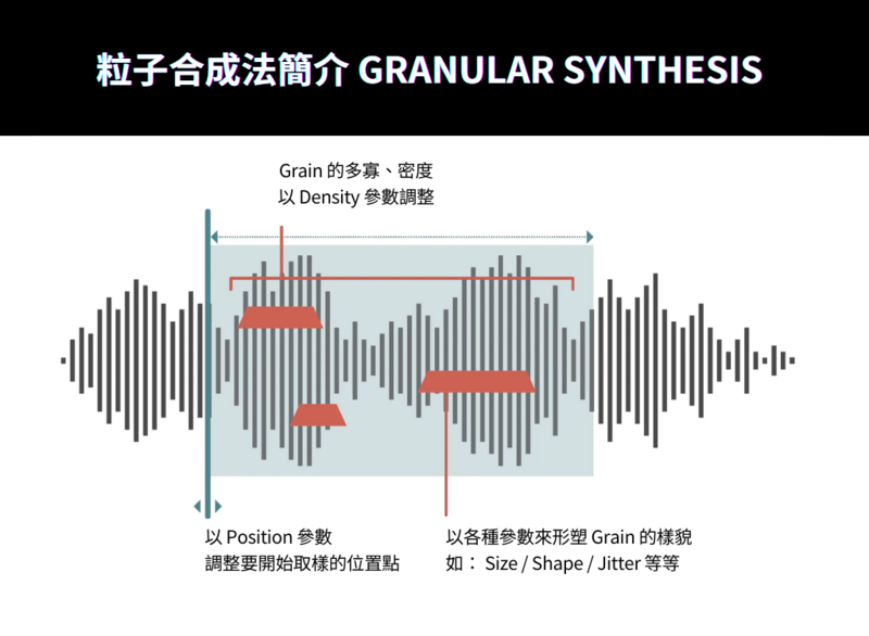 粒子合成法 Granular Synthesis 簡要來說是透過將一段音訊取樣(為一基於取樣 (Sample Based) 的合成方法)、切割成相當短時間的 “顆粒 Grains” ,再經由各種調變、操作(例如改變顆粒密度、間隔時間等等),來創造出與原有的音訊不同的聲音。