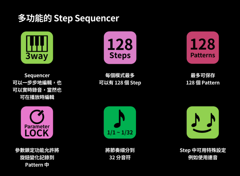 - 每一個 Step 可調整長度 (1/1 - 1/32)