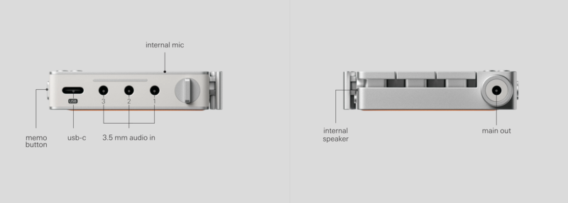 TP-7 配備了三個立體聲雙向插孔,可用作輸入或輸出,用於連接外部麥克風、耳機、工作室監聽系統或任何其他音訊設備,如 OP-1 Field 或 TX-6 ,以 6 個立體聲通道進行錄音。使用 USB-C 進行多通道音頻界面、 MIDI 、數據傳輸和充電,使用 BLE 和 MFi 進行無線連接。
