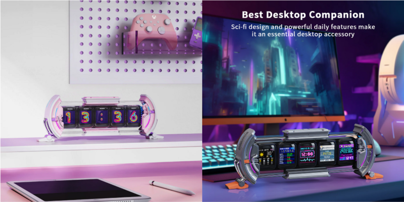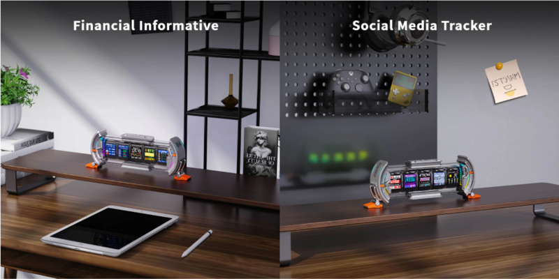 與以往產品以復古懷舊的風格打造相異,這一次, Divoom 以未來科幻風格推出“時空門 Times Gate” 顯示器,上方一共有五個獨立的 LCD 全彩顯示器,可以透過連結行動裝置,即時顯示各式各樣的資訊與圖示。