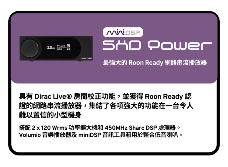 miniDSP SHD Power 數位串流綜合擴大機 | 搭載 Dirac Live 空間校正 | Roon Ready | 2x120W 強大輸出UMIK-1/2 系列麥克風需額外加購