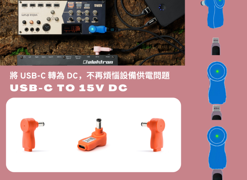 外觀是小巧的插頭,可安裝在 USB-C 線材的末端,改變輸出和尺寸,可以為使用非 5V 的電壓設備提供電源。為攜帶型電子設備提高自由度和靈活性,隨時隨地進行演奏。