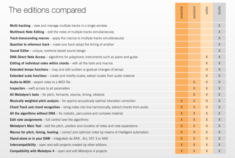Melodyne 各版本比較 圖表來源自 Celemony 官方網站