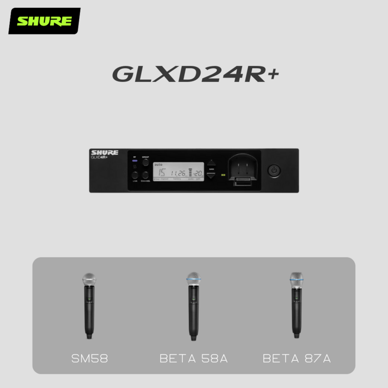 GLXD24R+ 系統可搭載 SM58, BETA 58A, BETA 87A 等人聲麥克風,提供清晰透明的數位音訊,GLXD4R+ 接收器採用半機架設計,適合固定安裝和任何專業演出,並運用雙頻技術和自動頻率管理確保穩定性。配備可充電的 Shure 鋰電池,續航可達 12 小時,非常適合現場演出。