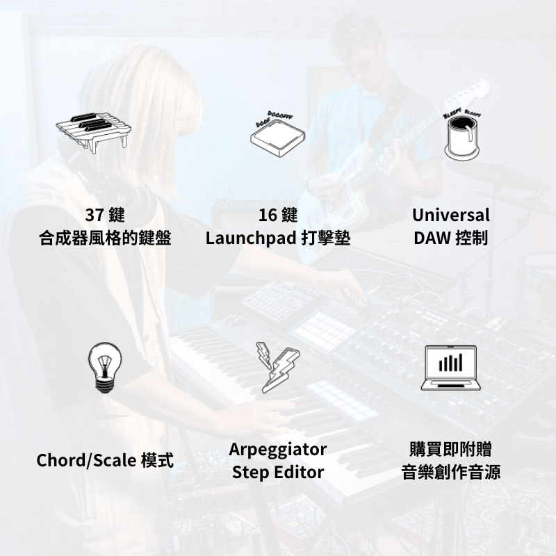 你可以彈奏樂器、製作節拍、啟動片段和場景,並直接控制 DAW 的混音器、設備及效果器。此外,Launchkey 還具備獨特且可編輯的琶音器、三種和弦模式讓您快速創作音樂進程、音階模式確保演奏在正確的調性內,並且有和弦檢測功能會在 OLED 螢幕上顯示當前和弦。