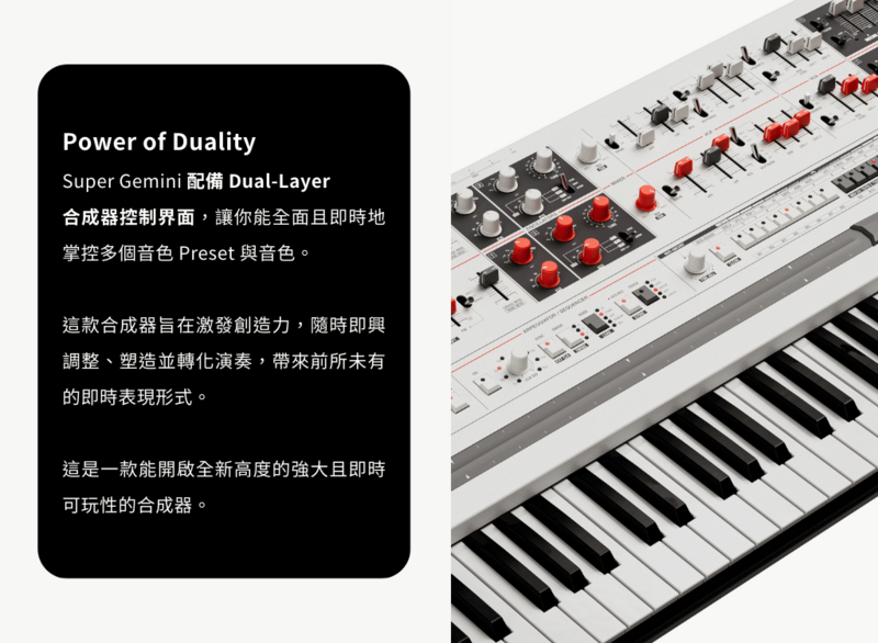 Super Gemini 將聲音創新與操作觸感相結合,配備 61 鍵半配重鍵盤,支持 Multi After-Touch,並附帶專為細微表現設計的 Ribbon 感應器(機身上方黑色條帶區域),提供用手勢探索聲音的方式。擁有 128 個表演 Presets、256 個音色儲存位置、32 種可更換波形與 16 個 Sequences,讓你可以安全地儲存並編輯音色,無需擔心資料丟失。
