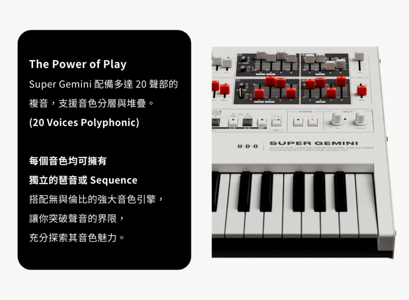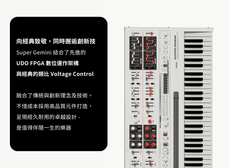 作為「Super」系列的第二款合成器,Gemini 代表了 UDO 技術的重大飛躍,繼承了 George Hearn 和 Super 6 開創的豐富音色。採用真正的立體聲 Binaural 訊號路徑,結合雙 FPGA 處理法與雙效果(FX)處理器,Gemini 將帶你進入聲音領域的冒險旅程 - 經歷耀眼的 Harmonics、震撼的 Sub-Tone,以及超乎預期的驚喜。