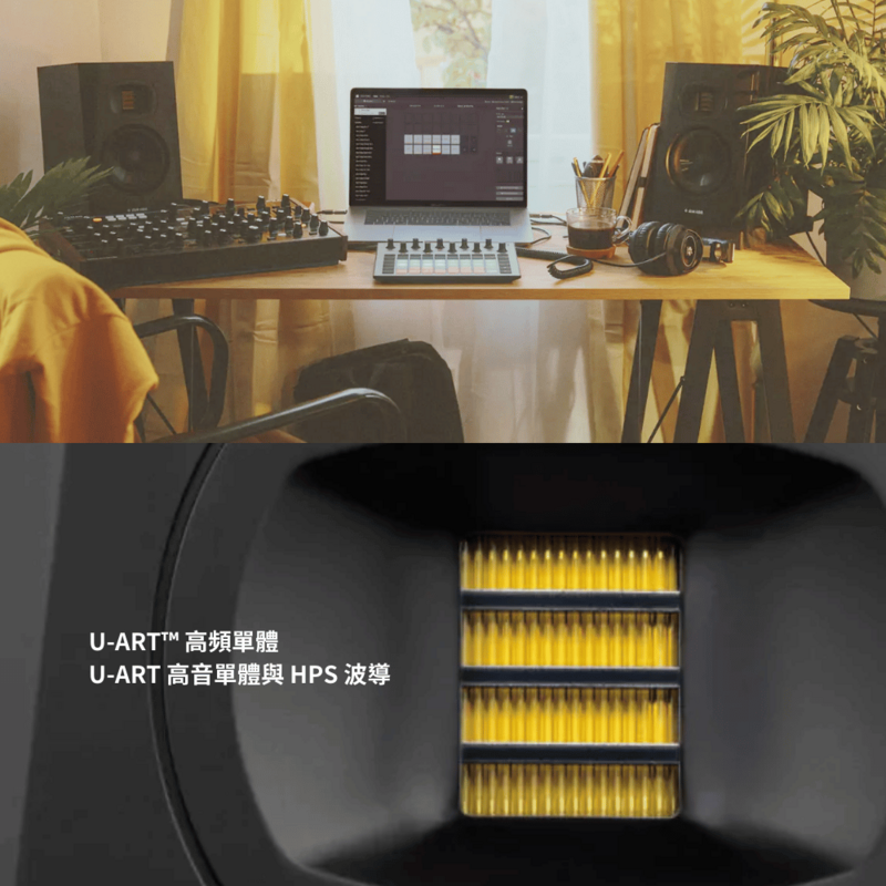 全新的 U-ART 1.9 吋 Accelerated Ribbon Tweeter,採用高科技聚醯亞胺薄膜製造,提供純淨且擴展至 25 kHz 的高頻響應。這在同價位的監聽喇叭中極為罕見,是高解析錄音與混音的突破性解方。