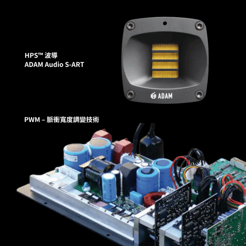 雖然 PWM 原理早已被提出,但開發出能在保持高效率的同時達到卓越音質的產品仍需長時間的技術演進。ADAM 採用這項技術於擴大機與電源模組(即不再使用傳統變壓器),並結合最先進的輸入與濾波電路,確保多聲道主動式監聽系統的最佳音質表現。
