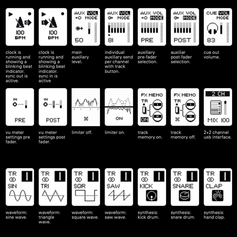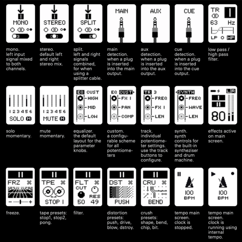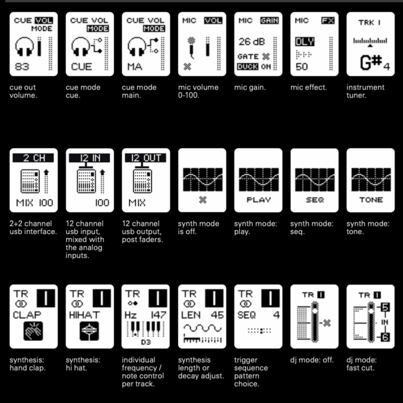 每通道設有一個迷你推桿與三個可自訂旋鈕,可切換 EQ、濾波、增益、壓縮等參數。主控部分提供兩組立體聲特效(涵蓋混響、延遲、合唱、失真、錄音帶等)、高品質母帶效果與 AUX send/CUE 分軌監聽。另具備內建調音器、簡易鼓機、合成器功能,可搭配外部 MIDI 訊號自由演奏。