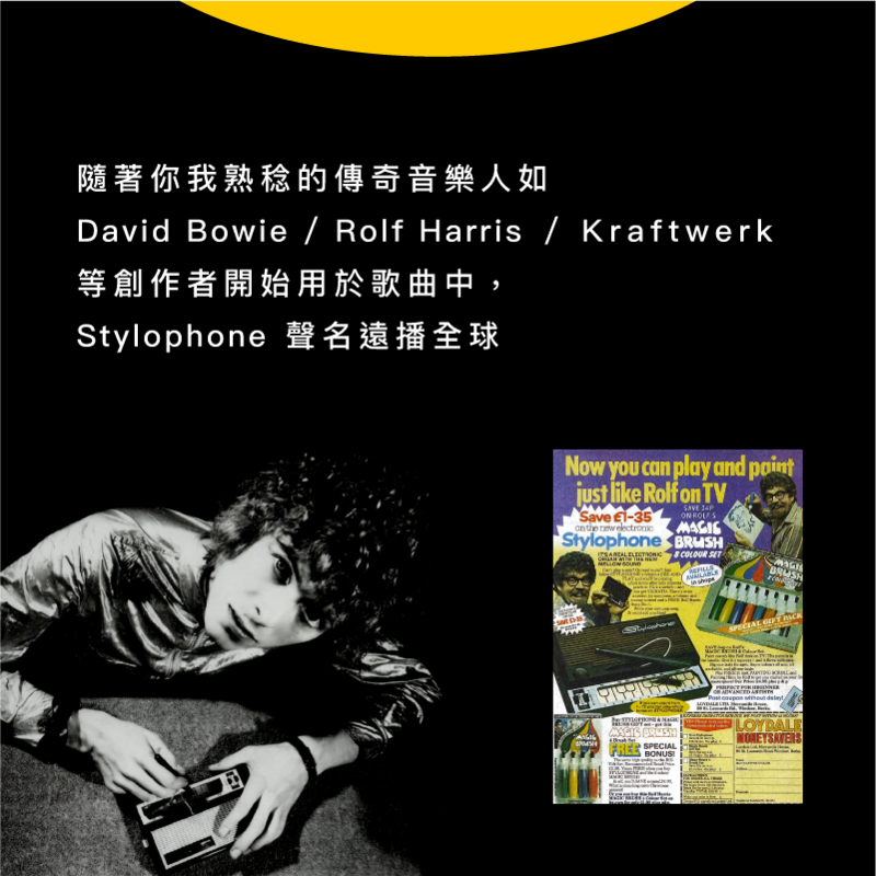 有著看似科幻新潮的外觀以及控制方式,但其實 Stylophone 已經問世超過 50 年了!在 1968 年,第一代 Stylophone 問世,與當時的主流合成器、其他樂器皆不同, Stylophone 沒有任何實體琴鍵,而是靠著一支筆在觸控面板上任意游移來彈奏聲音。這種新奇且易上手的演奏方式很快地讓這款合成器名聲大噪,從 David Bowie 到 The White Stripes,藝術家們使用 Stylophone 來創作、演出。