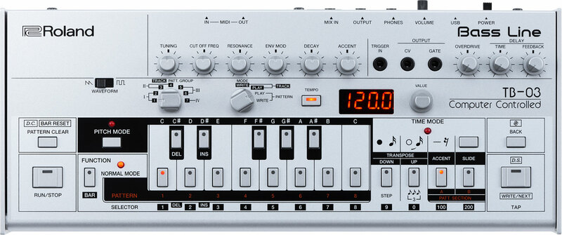 採用電池的 TB-03 是著名 TB-303 Bass Line 合成器的複刻版。原封不動保留面板配置與控制裝置,使用上具有與原始機相同的熟悉感。它的聲音也完整保留,採用 Roland 先進的 ACB 技術,重現了這款神奇顏色盒那種超洗腦的節奏律動。新的 TB-03 相較於原始機種還新增一些功能。四位數 LED 顯示幕讓編輯更簡易而更準確,overdrive 與 delay 效果器讓您大肆調整聲音,讓您的聽眾為之瘋狂。在錄音室使用時,TB-03 可以透過 MIDI 或是它的 USB 連接埠傳送控制訊息,USB 連接埠也可作為 24-bit/96 kHz 錄音介面來使用。