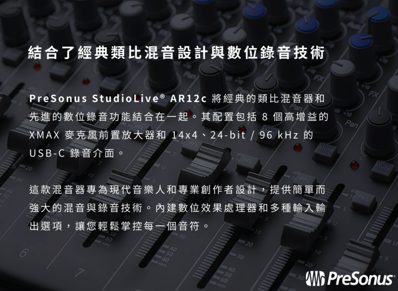 首頁 » 混音器 » 數位混音器 » PreSonus [已停售] StudioLive AR12c USB 數位混音器