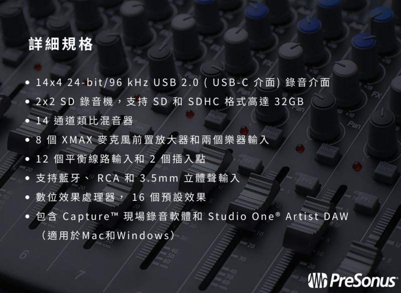 StudioLive® AR12c 擁有快速好上手的使用者介面設計,可說是是錄製 Podcasting 節目、直播節目以及音樂作品的最快速簡單的機器。 StudioLive AR12c 的混合設計具有原始的類比前端,具有 8 個高增益 XMAX 麥克風前級,除了是混音器之外,他也是個錄音介面,14x4 位元 96 kHz,並且更新到最新的 USB-C 2.0 接孔,可直接連接電腦去操作。音軌具有類比 EQ 調整 以及 Mic/Line 訊號切換 等等功能,用於音量較小的麥克風。此外,他還能連接 Bluetooth® 、當成錄製 SD 卡,可以滿足各種需求。