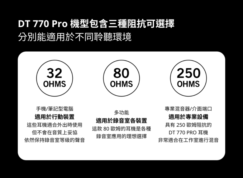 分為 32 Ω、80 Ω、250 Ω,250 Ω 版本符合錄音使等級需求。